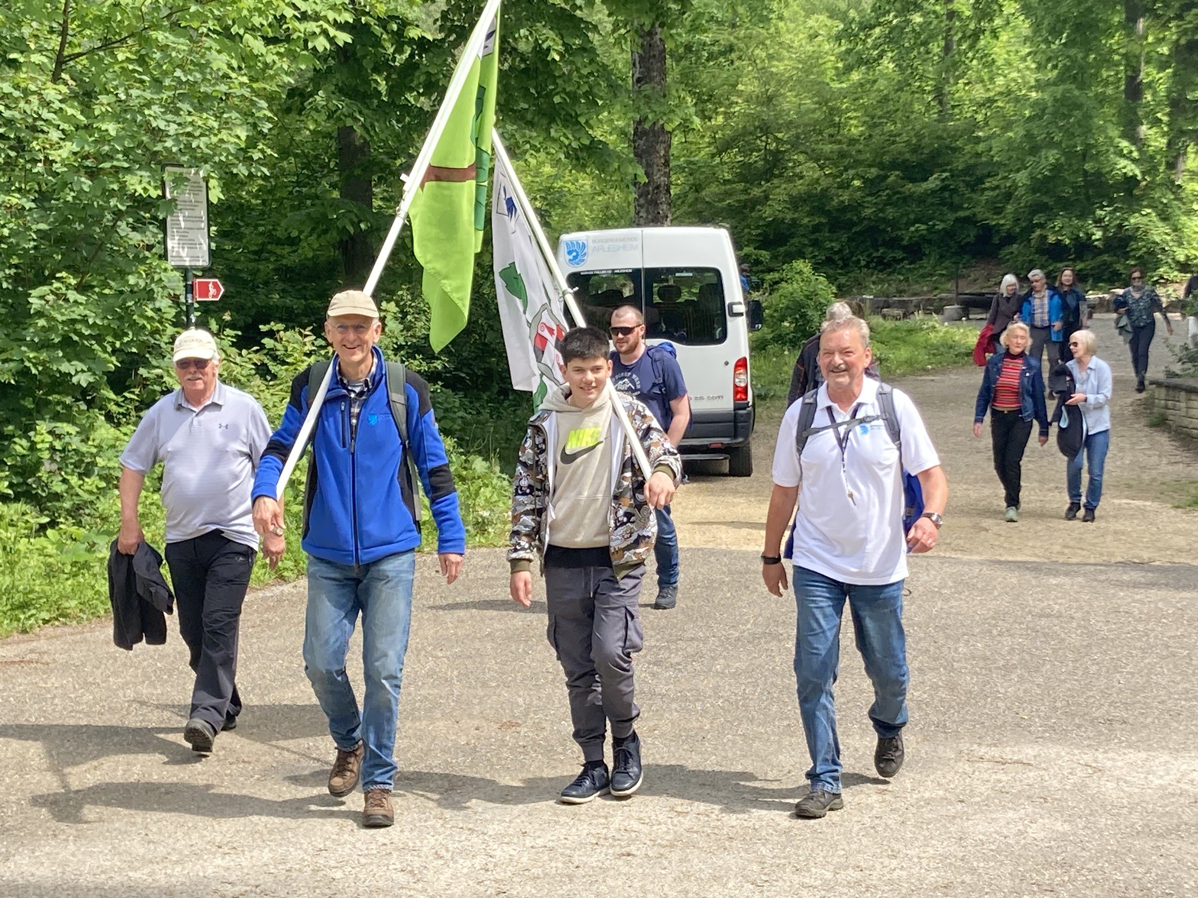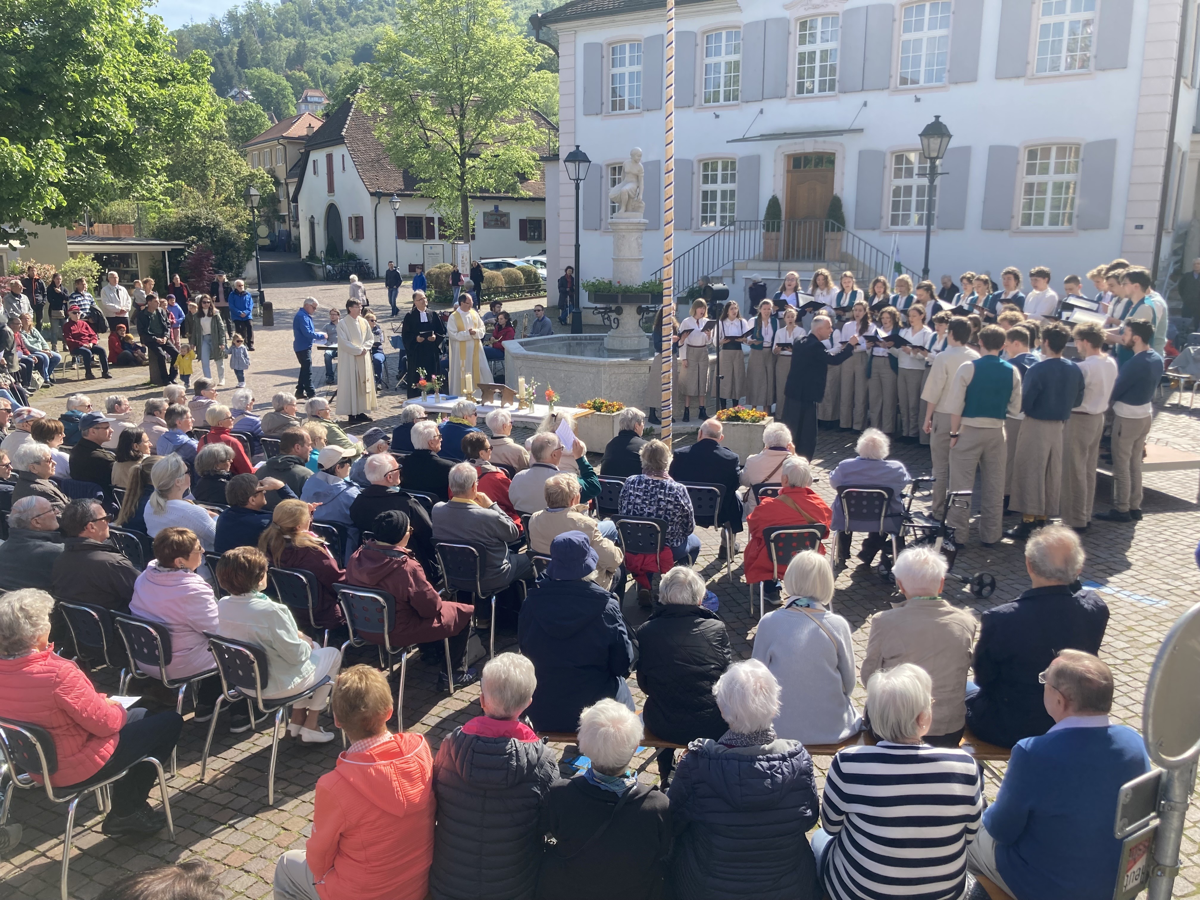 Endlich schien die Sonne. Und es war Banntag. Bei wunderbarstem Wetter durfte die Bürgergemeinde Arlesheim dieses Jahr auf dem Dorfplatz an Auffahrt zum Banntag begrüssen. Der Andrang war gross. Weit über 200 Menschen strömten am Donnerstagmorgen auf den Dorfplatz, um dem Ökumenischen Gottesdienst, welcher von den Pfarrern unserer drei Landeskirchen Thomas Mori (ref), Alexander Pasalidi (rk) und Simon Huber (ck) gestaltet wurde, beiwohnen zu können. Umrandet wurde die feierliche Zeremonie vom Musikverein Arlesheim und von rund 40 Sänger*innen des Schweizerischen Jugendchors, welcher im Rahmen des Europäischen Jugendchorfestivals unterwegs war, und einen Zwischenhalt in Arlesheim einlegte. Auf ihrer Homepage präsentiert sich der Chor mit folgendem Satz: Die Schweiz ist ein Buch voller Geschichten, Mystik und Schönheit. Diese Geschichte wollen wir als Chor erzählen. Passender kann es nicht beschrieben werden – wunderschön war der Gesang. Im Anschluss an die Predigt führte die Banntagsrotte, unter der Leitung der Bürgerräte Thomas Hagen und Jürg Dünner, über den Spitalwaldweg hoch zum Rehliplatz bei der Burg Reichenstein. Der Zwischenhalt war verdient und die Wandergruppe wurde mit einem feinen Apéro belohnt. Weiter ging’s zum Pulverhüsli, wo der Musikverein Arlesheim zu leckerem Risotto und Waldfest lud. Auch für musikalische Unterhaltung war gesorgt. Der Festplatz war bestens organisiert; das Knowhow und der Einsatz der Musiker*innen wird von der Bürgergemeinde sehr geschätzt. Auch zu wissen, dass wir in den kommenden Jahren am Banntag auf den Musikverein zählen können, ist für uns von grossem Wert. Ein vergelt’s Gott allen die zu diesem wunderbar sonnigen und gelungenen Anlass beigetragen haben. Und ein merci vill mol der Bevölkerung für das zahlreiche Erscheinen! Wir freuen uns bereits heute auf den 9. Mai 2024 zu einem weiteren Banntag. Veronika Käch, Bürgerrätin
