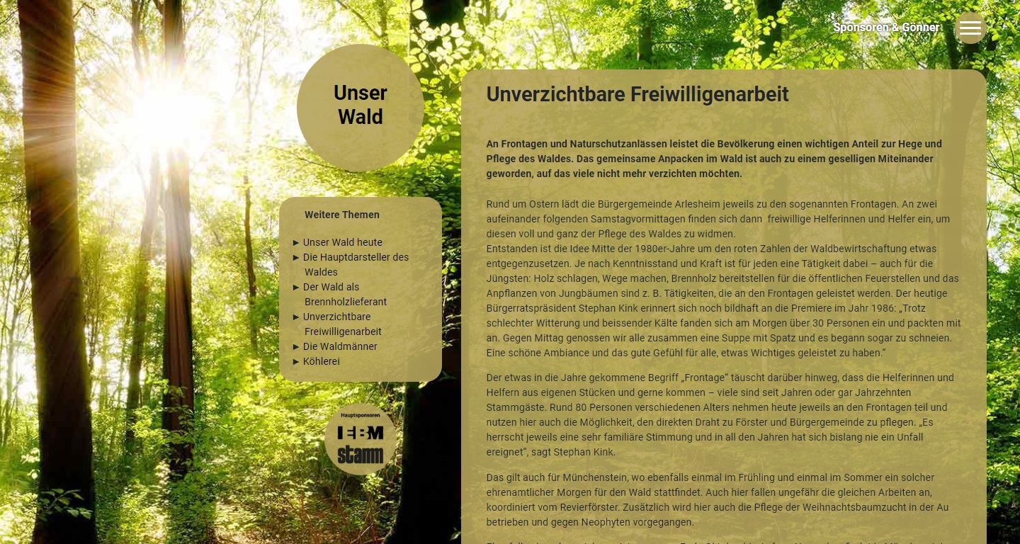 Entstanden ist die Idee Mitte der 1980er-Jahre um den roten Zahlen der Waldbewirtschaftung etwas entgegenzusetzen. Je nach Kenntnisstand und Kraft ist für jeden eine Tätigkeit dabei – auch für die Jüngsten: Holz schlagen, Wege machen, Brennholz bereitstellen für die öffentlichen Feuerstellen und das Anpflanzen von Jungbäumen sind z. B. Tätigkeiten, die an den Frontagen geleistet werden. Der heutige Bürgerratspräsident Stephan Kink erinnert sich noch bildhaft an die Premiere im Jahr 1986: „Trotz schlechter Witterung und beissender Kälte fanden sich am Morgen über 30 Personen ein und packten mit an. Gegen Mittag genossen wir alle zusammen eine Suppe mit Spatz und es begann sogar zu schneien. Eine schöne Ambiance und das gute Gefühl für alle, etwas Wichtiges geleistet zu haben.“